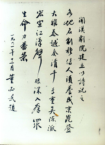 武漢漢劇院是全國有較大影響的藝術(shù)團體,其前身為武漢漢劇團。一九六二年在周恩來總理的關(guān)懷下,正式建院,國家副主席董必武贈詩:“京昆登大雅、秦越奏清平,尊重吳陳派,宏宣江漢聲,根深如群眾,生命力蕃榮”以示祝賀。
